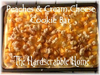 I had bought the peaches thinking I would make Peaches & Cream Cheese Cake, but instead decided to adapt that recipe to a cookie bar instead. BIG MISTAKE!!! Not really. It was delicious. DANGEROUSLY DELICIOUS as the title of this post says. Dangerously delicious because I had counted on this wonderful treat to last us more than just TWO DAYS!! Yep, we devoured them in 2 days. We hang our heads in shame.